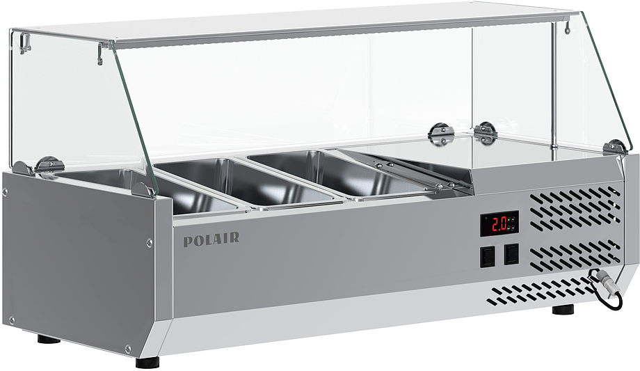 Холодильная витрина POLAIR VT1vEN 1/3 предназначена для демонстрации, охлаждения и кратковременного хранения ингредиентов для пиццы и салатов на предприятиях общественного питания и торговли. Модель оснащена стеклянным защитным колпаком. Обшивка корпуса шкафа изготовлена из нержавеющей стали и обеспечивает механическую прочность и долговечность витрины. Оборудование рассчитано на работу при температуре окружающей среды до 32 °C и относительной влажности воздуха до 80%.