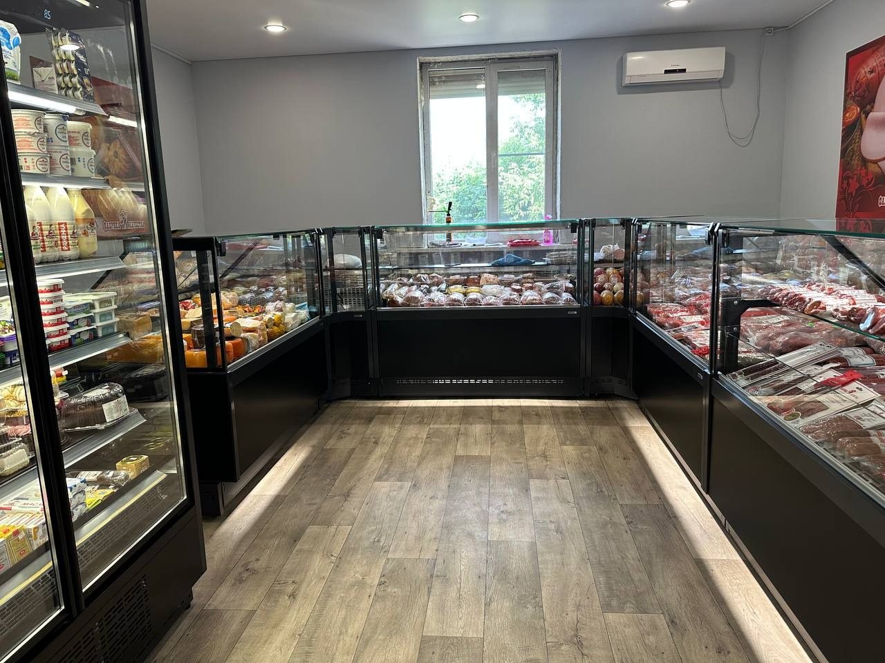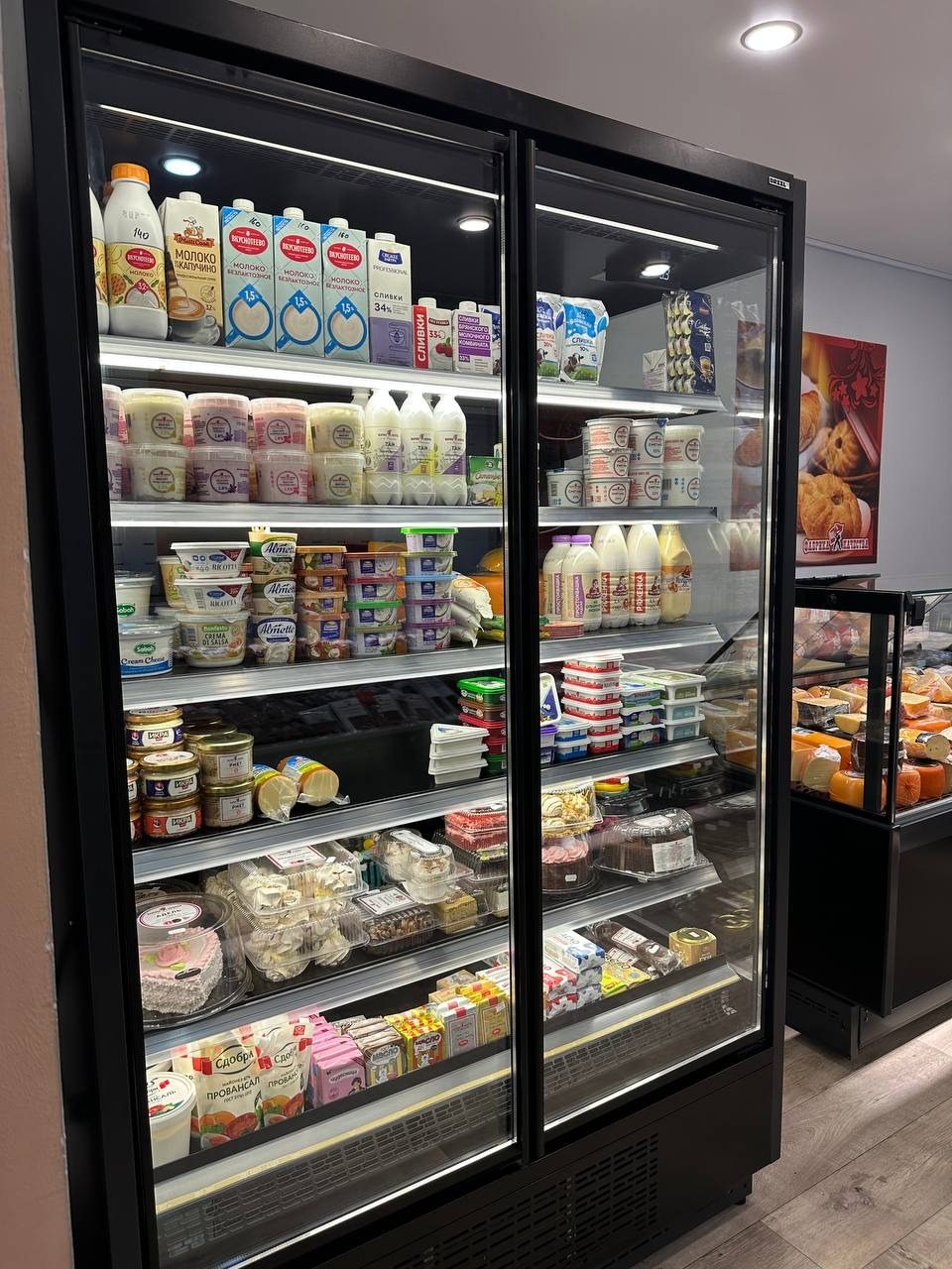 Магазин оснащен холодильным оборудованием торговой марки Dazzl™. Обратите внимание, что витрины имеют подсветку нижнего фронта, что создает эффект парения. А актуальный современный дизайн плоских и прямых форм предлагает отличную обзорность продукции.